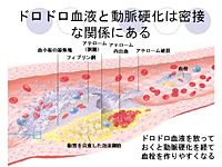 動脈のような大きな血管もありますが、実際に働くのはそこから枝分かれした毛細血管です。ここから静脈を形成して戻ってきます。毛細血管は、7μ(1μ=1000分の1mm)と細胞が1個やっと通過できるぐらいの狭いところを、血液が駆け巡っています。毛細血管の全長は、1固体につき9万から10万kmといわれています。地球を2周半する距離に相当します。血液の流れがいいのを「さらさら」、悪いのを「どろどろ」と表現しています。しゃれた表現にすると、「ヘモ(血液)レオロジー」です。血液流動性とは血液が「さらさら」なのか、「どろどろ」なのかということです。高脂血症、肥満、高血圧、糖尿病では血液レオロジーが悪くなってどろどろし、流れが悪くなります。生活習慣病、メタボリックシンドロームに入るものです。これ以外にも注意を要するのは、食事面では、肉が大好き、飲酒のし過ぎ、糖分の摂り過ぎ、外食が多いなどです。運動面では、エレベーターや車を使う運動不足です。東京の人はよく歩くそうですが、地方の方が東京に来ると疲れるのですぐに車を使うそうです。ストレス面では、働き過ぎ、不規則な生活、深夜勤務、ストレスを溜める、喫煙です。血液の成分から流れが悪くなる状態を考えてみましょう。毛細血管の中を赤血球がしなやかに形を変えながら通っています。しなやかさが失われると詰まりやすくなり、どろどろします。コレステロールが高くなったり糖分が多くなると赤血球の膜が異常になり、しなやかさがなくなって、「ねばねば血液」と表現されるようになります。